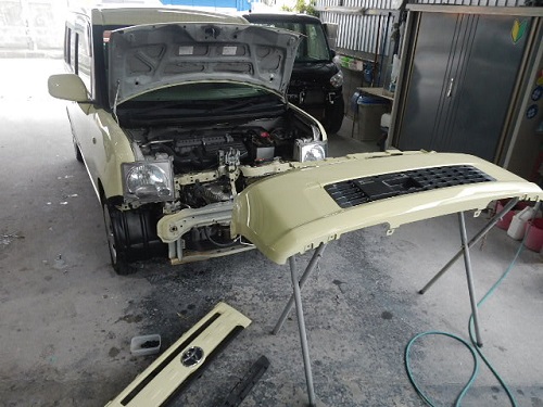 ▼フロントバンパーはキズ付近をサンダーで足付けしてパテ→サフェーサーを塗布します。