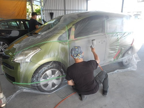 マスキングが終わるとホコリや油分などをふきながら脱脂して塗装開始です。