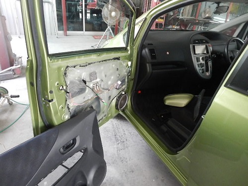 ▼翌日塗装の際に邪魔になるドアミラーやドアハンドル、水切りモールなどを取り付け、