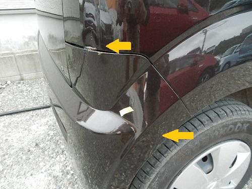 ▼リアフェンダーにヘコミ、リアバンパーにぶつかった際にできた変形が見られます。