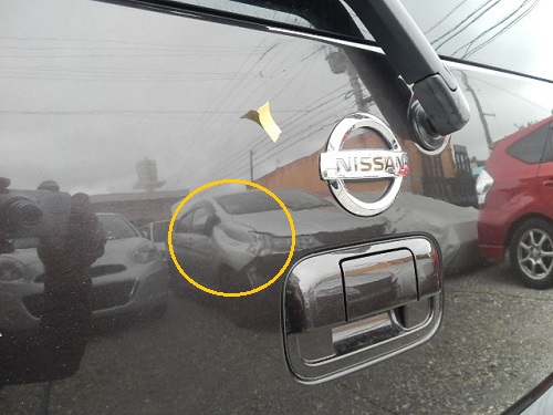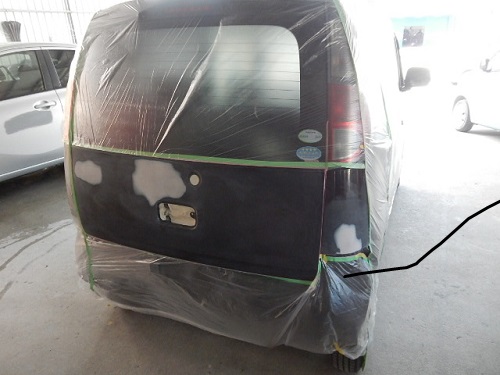 ▼リアゲートには5センチ四方のヘコミがあるのでここも板金修理します。