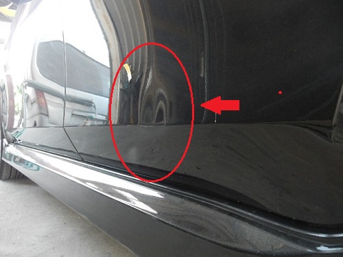 ▼リア部分はリアドアに10センチ四方のヘコミを確認。
