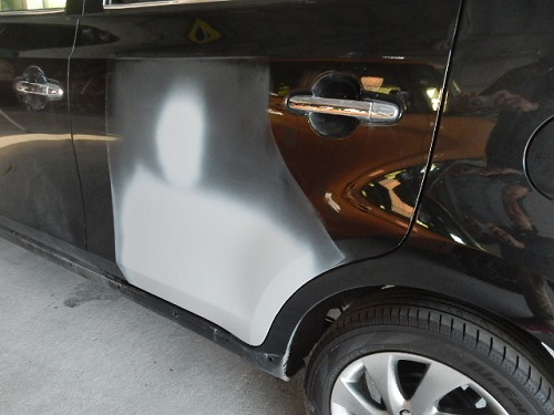 ▼運転席ドアはパテで処理した後サフェーサーを塗布します。