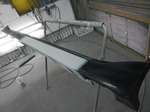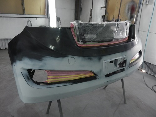 ▼バンパーもパテ処理を終えてサフェーサーを塗布し同時進行で