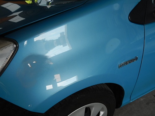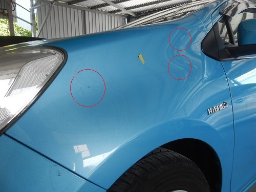 ▼フロントフェンダーにも3ヵ所のヘコミを確認。