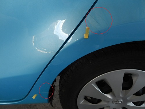 ▼リアフェンダーとリアドアにもきずとへこみがあるので板金修理が必要です。