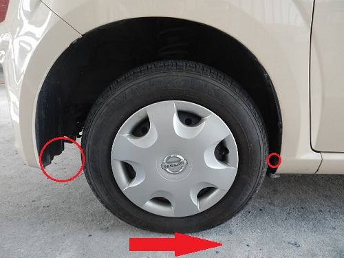 お客さんがフロント部分を何かしらにぶつけてフロントタイヤが後方に寄って内側に