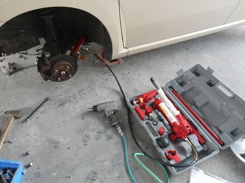 ▼ある程度まで押し出して変形したロアアームとを取り外して他の部品にも