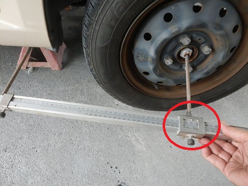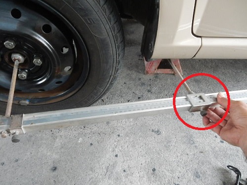 ▼ロアアームなどすべての部品を取り付けて専用のゲージで寸法を