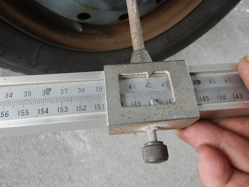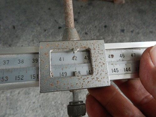 ▼計測する場所にゲージを当て覗ゲージを覗くと42センチ(上)の表示。