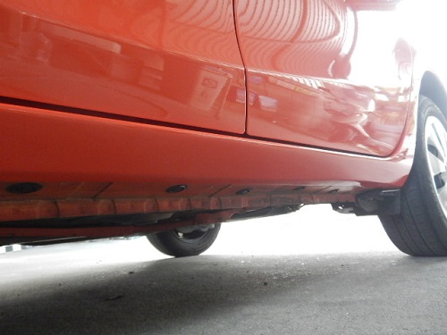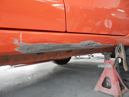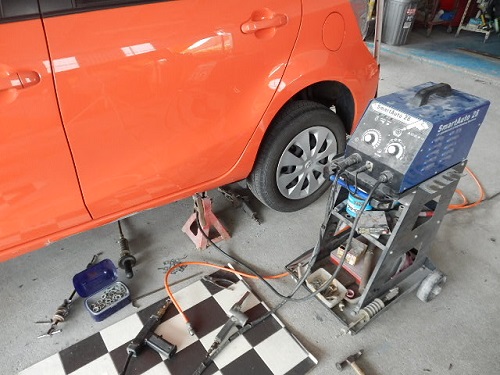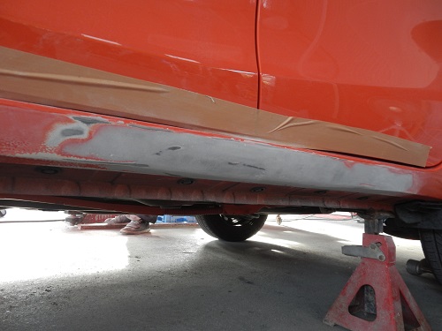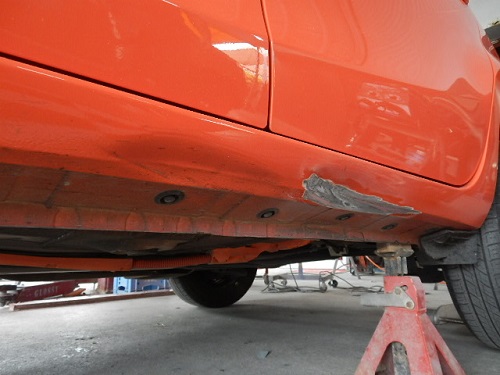 ▼低い箇所の板金修理は大変ですがジャッキアップすることで
