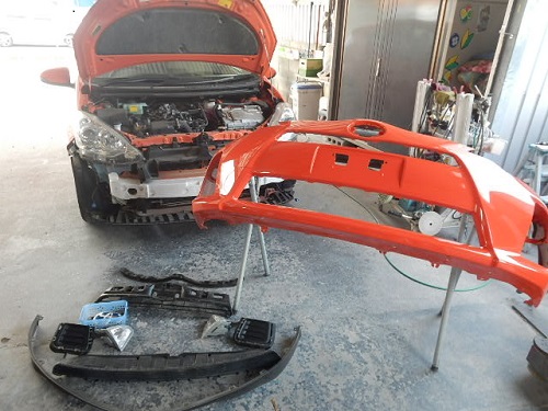 ▼フロントバンパーは飛び石によるキズを処理してサフェーサーを塗布します。