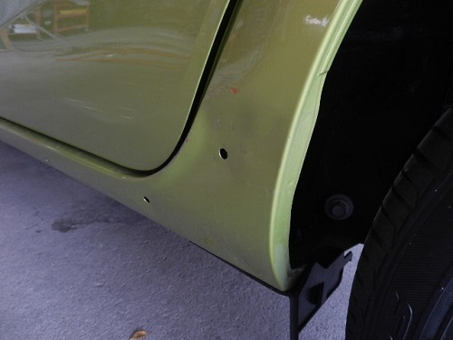 ▼ヘコミ部分をサンダーで塗膜を削りそこへ専用のワッシャーを十数個溶接します。