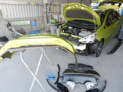 ▼フロントバンパーとスポイラーにガリキズがあり目立つので修理していきます。