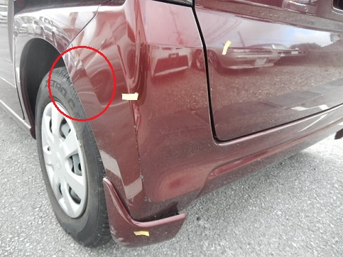 ▼リアバンパーにはキズとぶつけた衝撃による変形(赤丸印)が見られます。