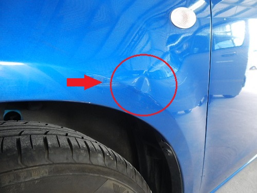 ▼フロントフェンダー左には5センチ四方のヘコミ。