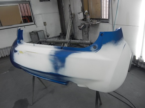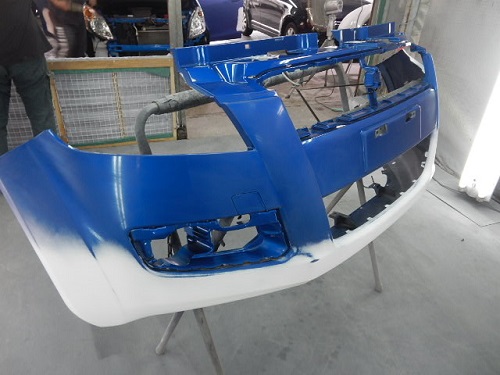 ▼ボディーの塗装準備の合間にバンパー類から塗装を始めます。