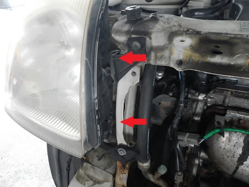 ▼ヘッドライト右は取り付けの部分が破損していました。