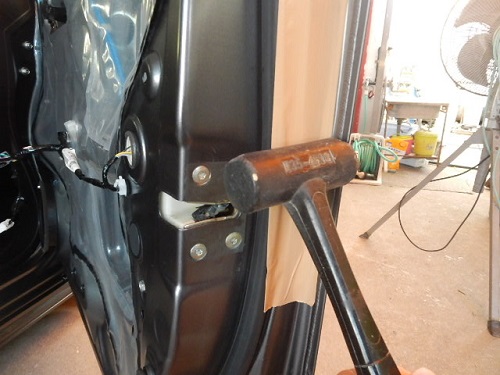 ▼最初の作業はドアの変形部分を内側から最初は木を当ててハンマーで叩き荒出しして、
