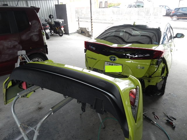 トヨタプリウスPHVのリアバンパー修理依頼です。