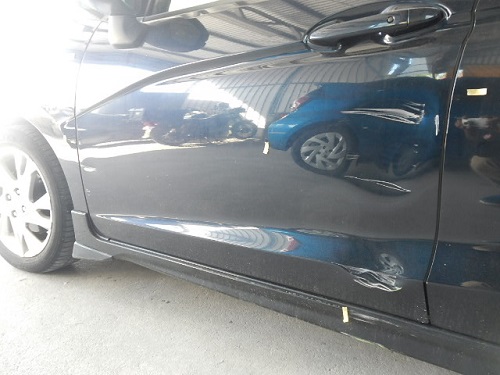 助手席ドアの板金修理のご依頼です。ドアハンドル下に凹みがあります。ステップパネルまで板金修理していきます。まずは、ヘコミ部分を引き出してパテを盛って研磨し、サフェーサーを塗布→塗装の工程で仕上げて行きます。
