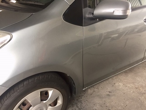 ▼フェンダーのみではなく助手席ドアの部分も修正跡があったので念の為塗膜を剥がすと同様に塗膜が浮き始めていました。周辺を剥がせるだけ剥がして板金修理していきます。サビをキレイに除去して新たにパテを盛り研磨して表面を整え処理しサフェーサーを塗布→乾燥→足付け→マスキング→脱脂→ベースコート→トップコート(クリアー)の工程を行い作業を進めていきます。