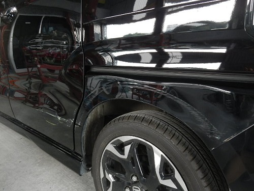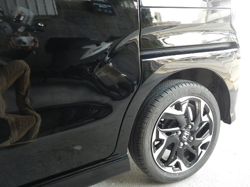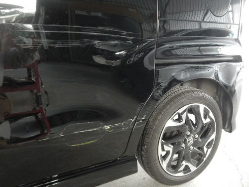 横から見るとこうゆう感じできず・へこみがあり、スポット溶接にて凹んだ箇所を引き出し→パテ処理→サフェーサーを塗布→塗装と作業をして行きます。