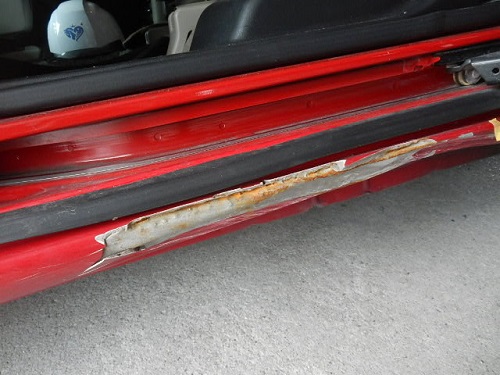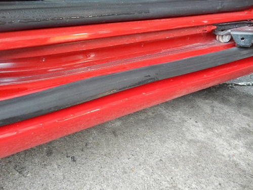 ▼スライドドア下側のロッカーパネルの損傷です。ドアとの隙間も無いほどです。