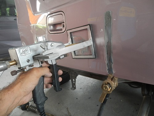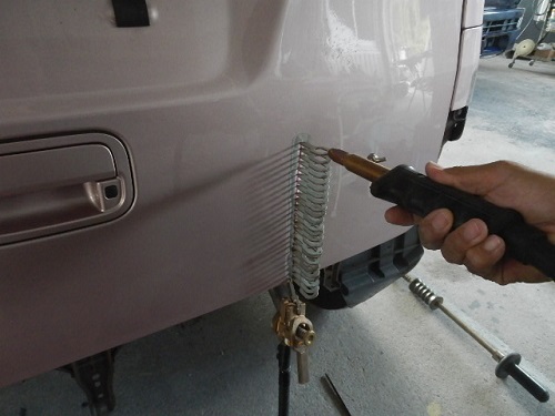 ▼リアバンパーカバーを取り外して作業しやすいようにします。まずはへこみ過少に専用のワッシャーを溶着していきます。