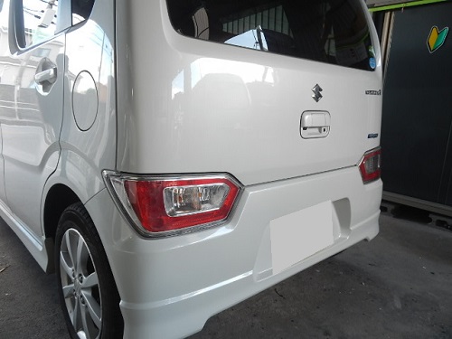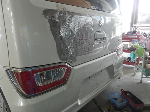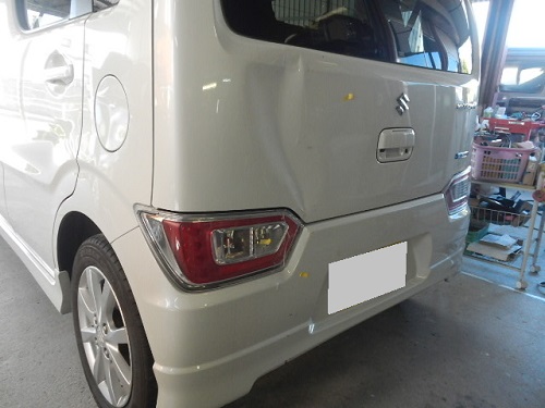 ▼スズキ ワゴンRのバックドア、リアバンパーカバーの板金修理のご依頼です。