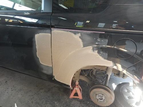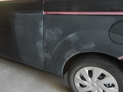▼パテの研磨作業を終え周りをマスキングしてサフェーサーを塗布します。その後1日よく乾燥させ塗装準備をして行きます。