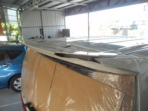 ▼ミツビシ デリカD5の修理依頼での入庫です。リアゲート付近をぶつけてしまったようで、リアガラスはもちろんスポイラーまで損傷していました。