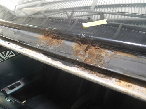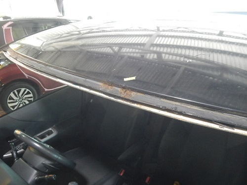 ▼ルーフの丁度中心あたりにサビが出ていました。表からのサビはそうでなくてもフロントガラスを外すと内側のサビが大きいです。表面のサビが小さくても中の方は結構サビが進んでいるのでご注意ください。