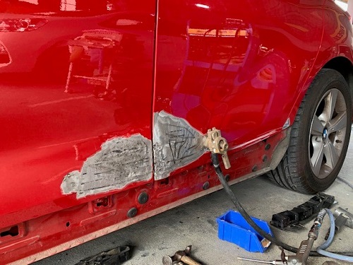 ▼まずは、サイドステップを取り外してドアの補修から専用の器具にて、根気よく引き出し手の表面で触りながらパネルの引き出し具合を確認していきます。