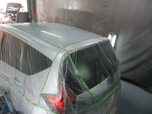 ▼翌日塗装準備の足付け等をして塗装箇所以外はマスキングで覆っていきます。